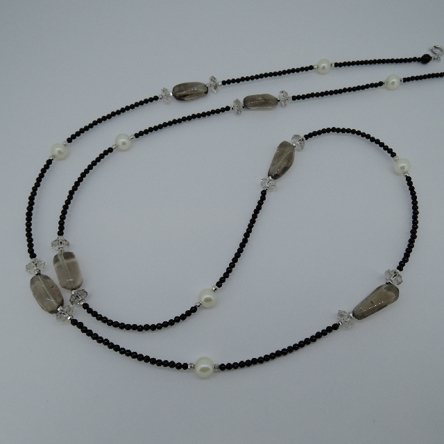 アコヤ真珠・スモ-キ-クオ-ツ・オニキスネックレス(85cm)