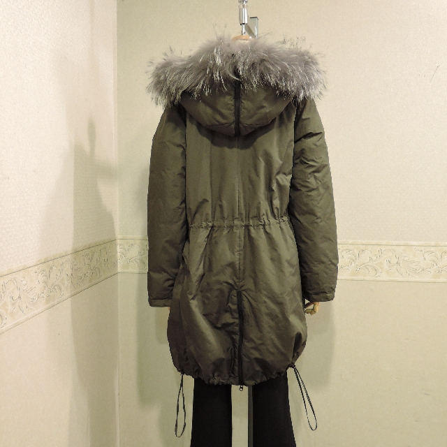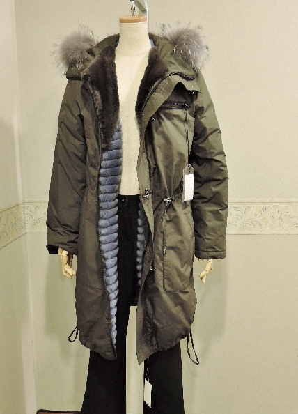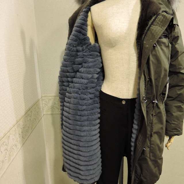 今流行のモッズコ-ト! 隠れた裏側にゴ-ジャスで暖かいレッキスのファ-をチラリと見える衿の近くは同色のモスグリ-ン・本体は爽やかなブル-でホックが2ケ所である為アイデア次第で色々装い方ができます