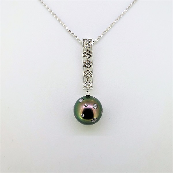 K18WG黒蝶真珠(14.6mm)ダイヤモンド(0.52ct)ペンダントネックレス