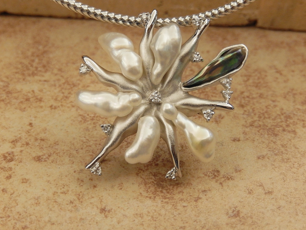 K18WGアワビケシ(天然)真珠 南洋ケシ(天然)ダイヤモンドペンダント・ブローチ・ネックレス