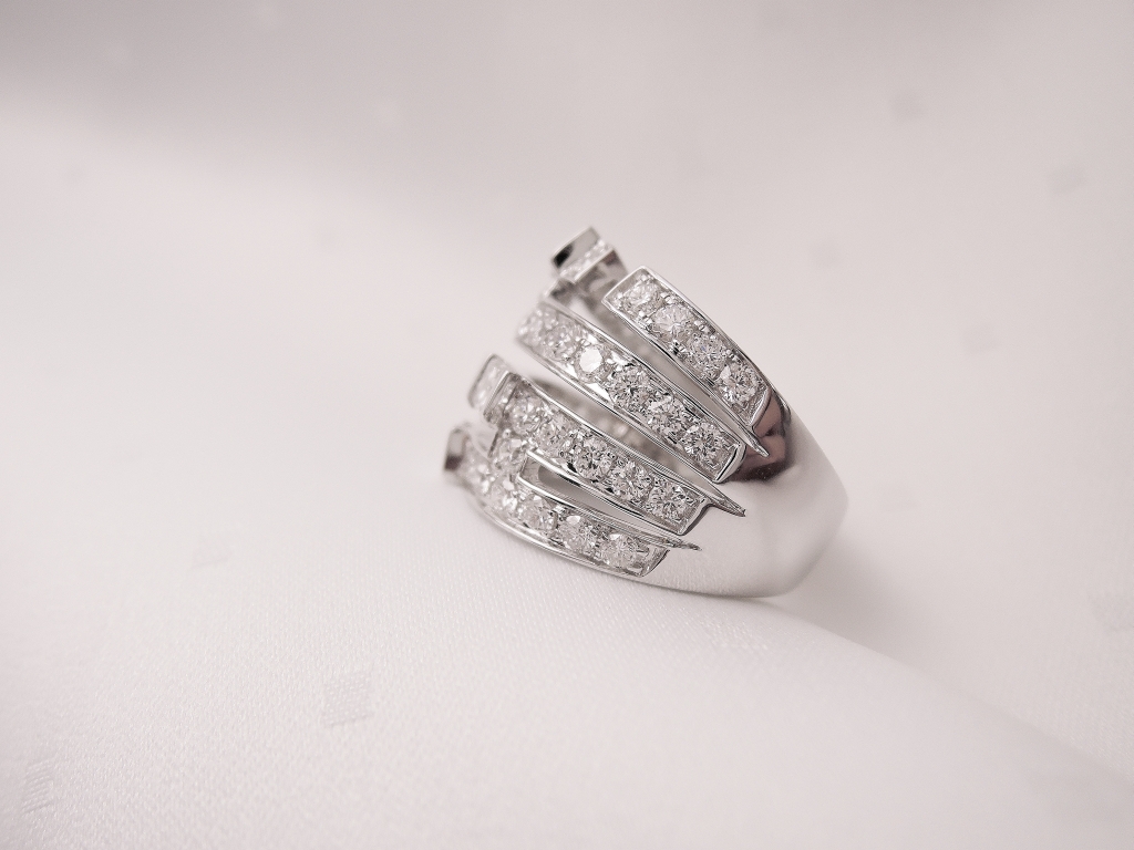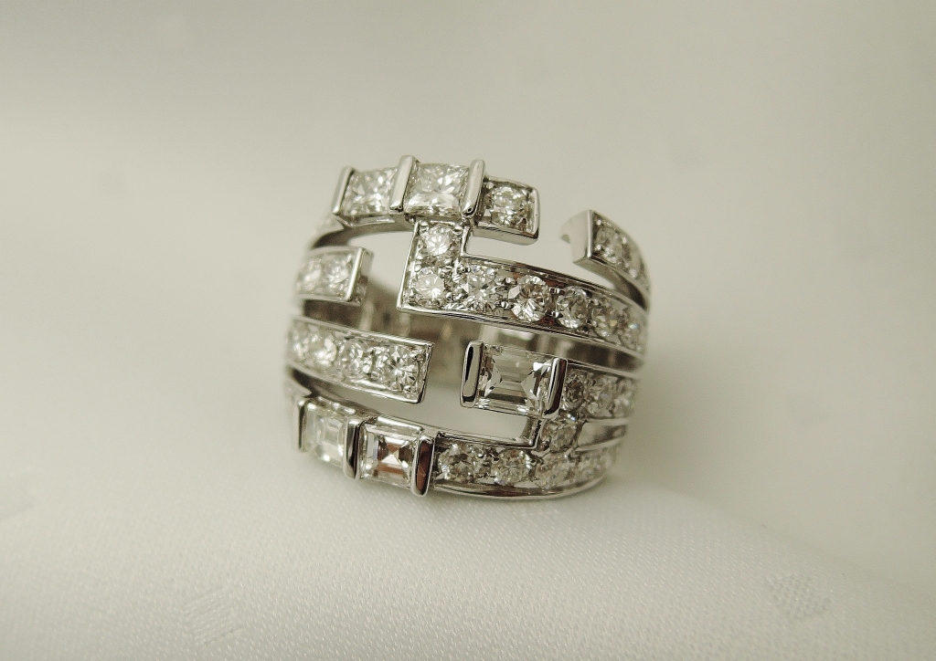 角ダイヤモンドとラージメレーダイヤモンドのコンビが華やかです。