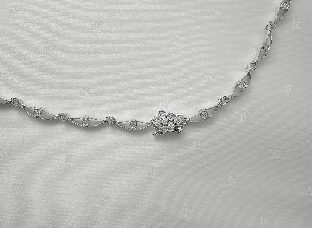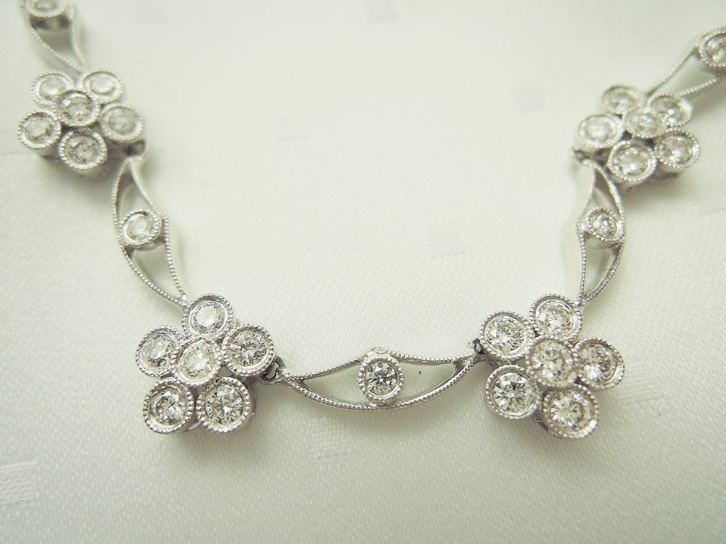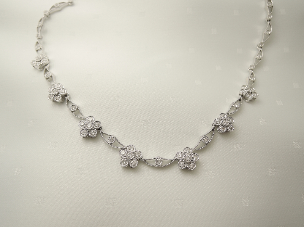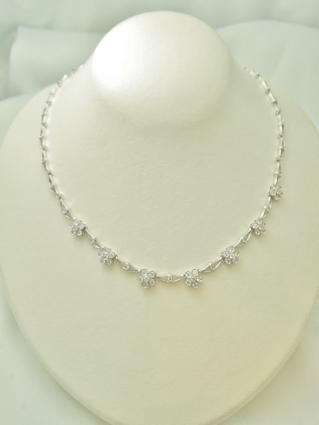 ミル打ちしたホワイトゴールドと、ダイヤモンドを全周セットしたアンティーク調ネックレス。クラスプ側までダイヤモンドがセットされています。 華やかからシンプルの装いまでジャストフィットします。