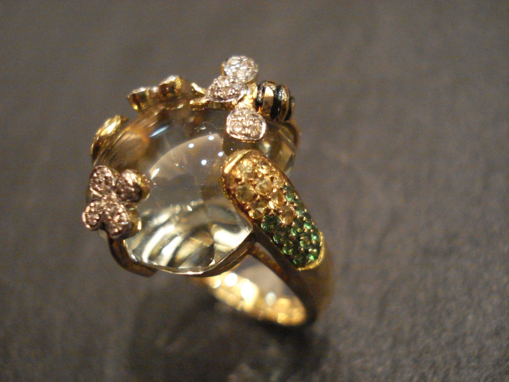 K18水晶ダイヤモンド・グリーンガーネット・サファイヤリング