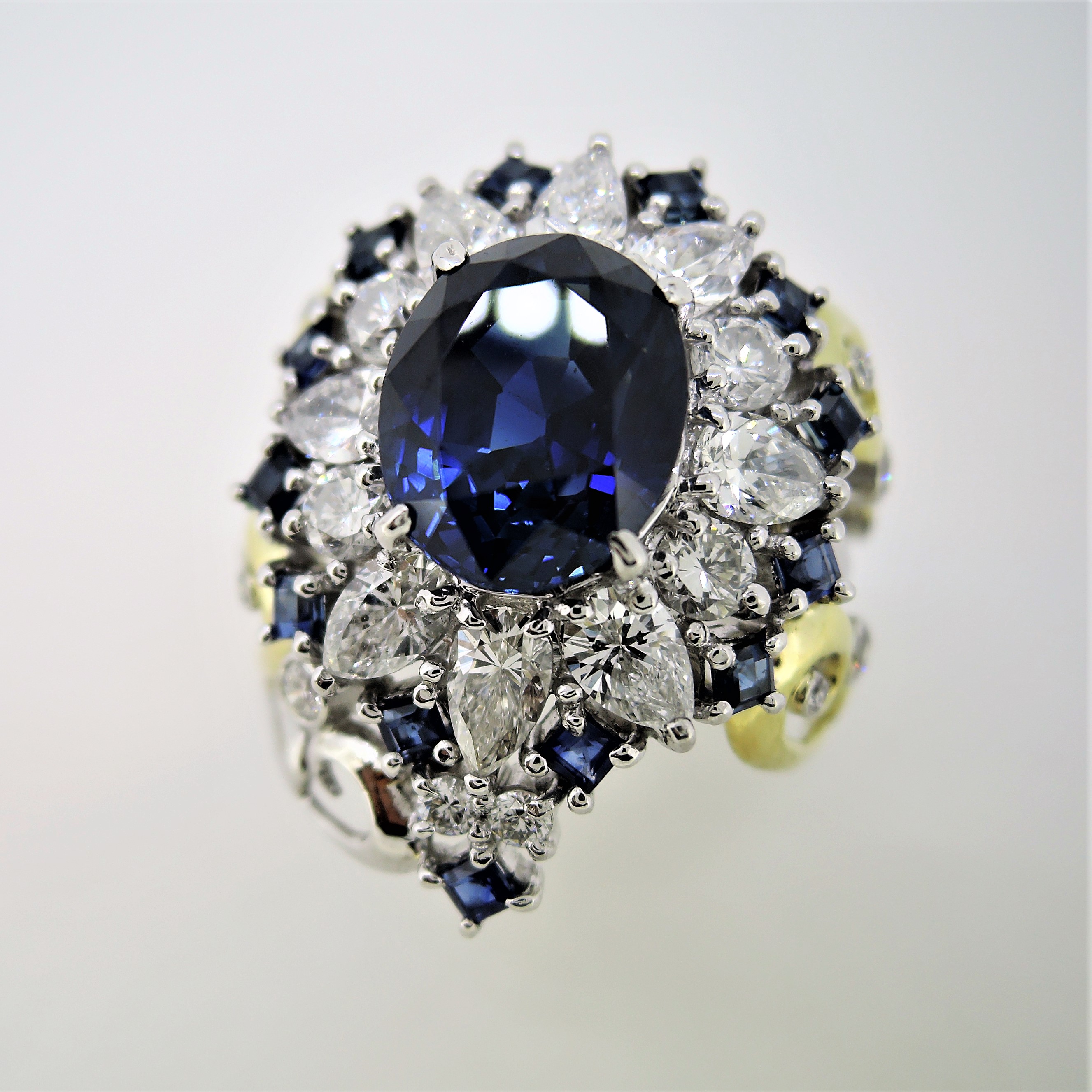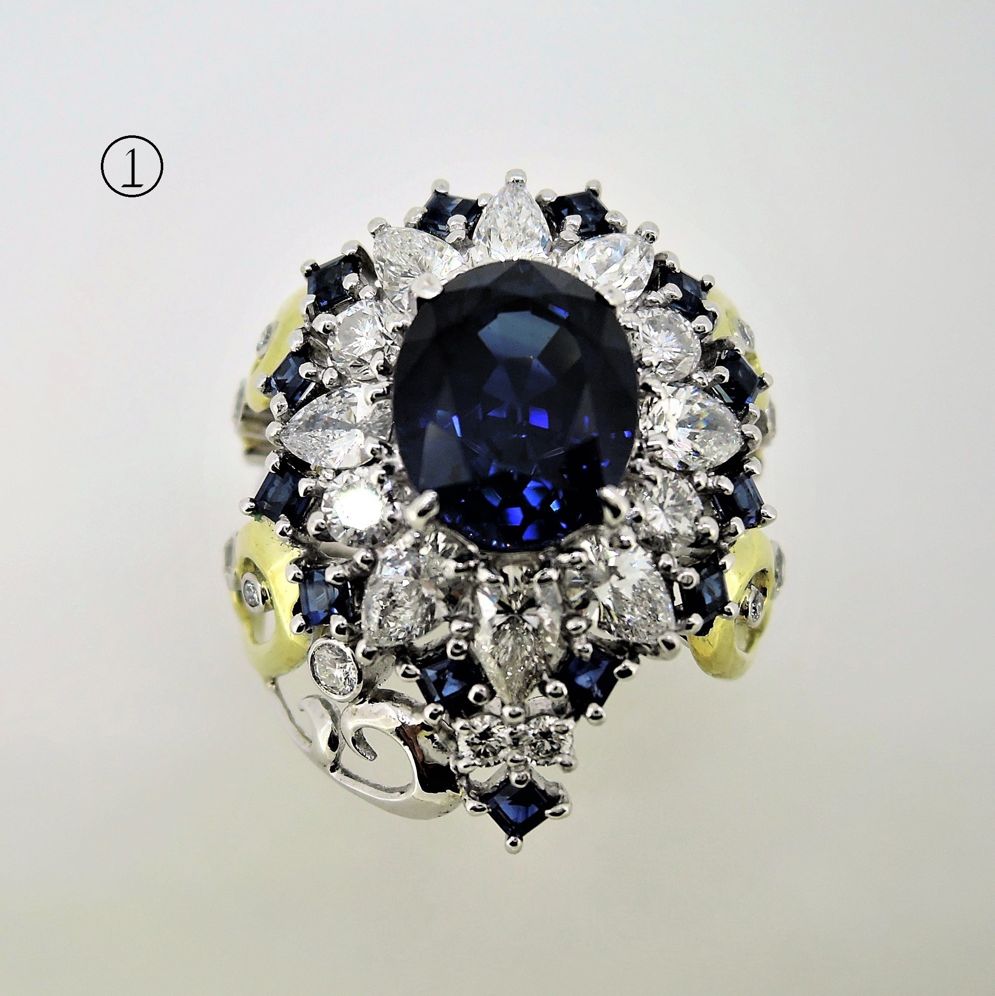 ノ-マルなデザインのダイヤモンド取り巻きのサファイアリングにサファイアメレのイヤリングを合体させてのリフォ-ムです。