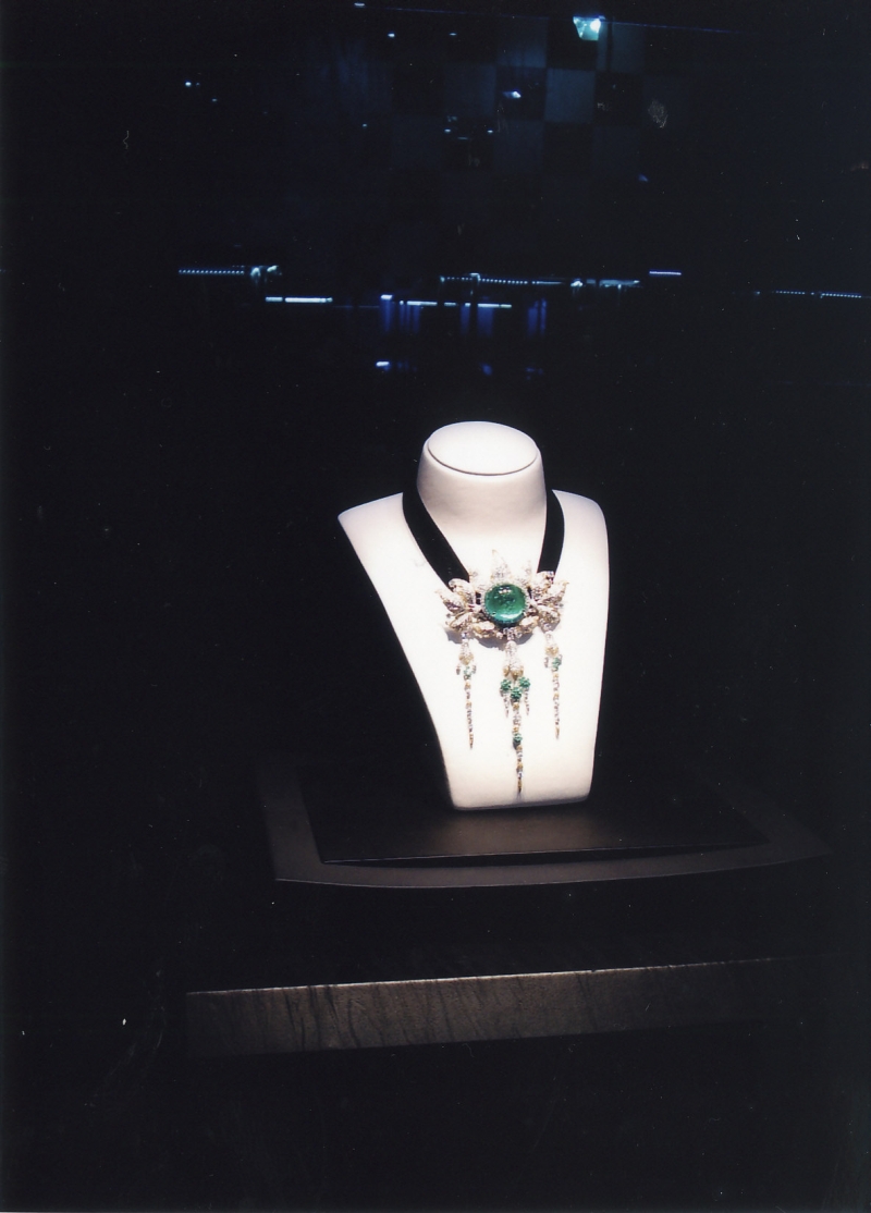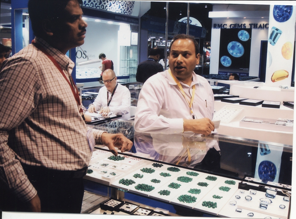 下部写真:インド人宝石裸石輸出商のブースにて、エメラルド裸石を
