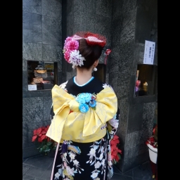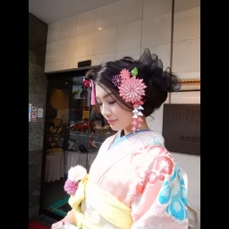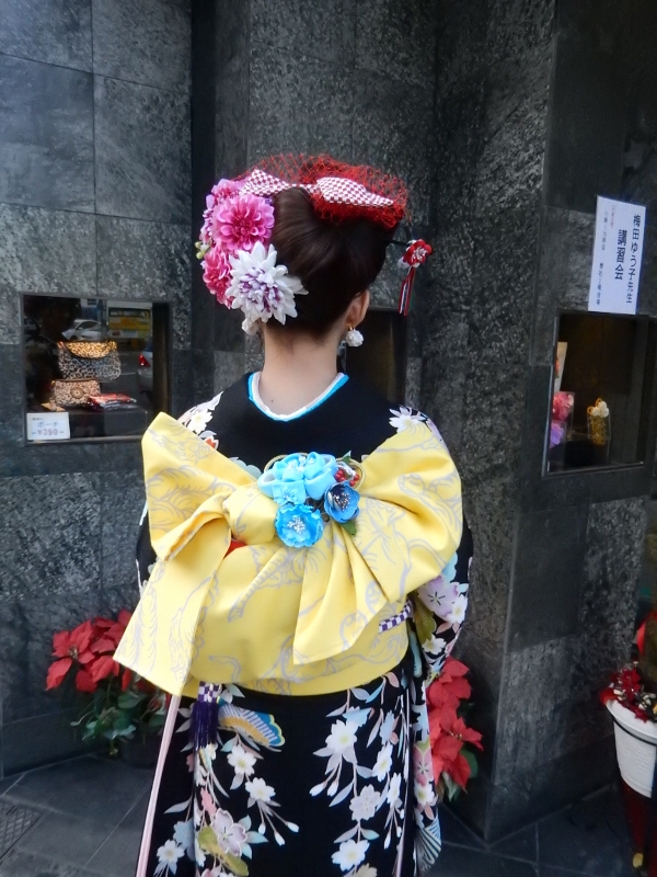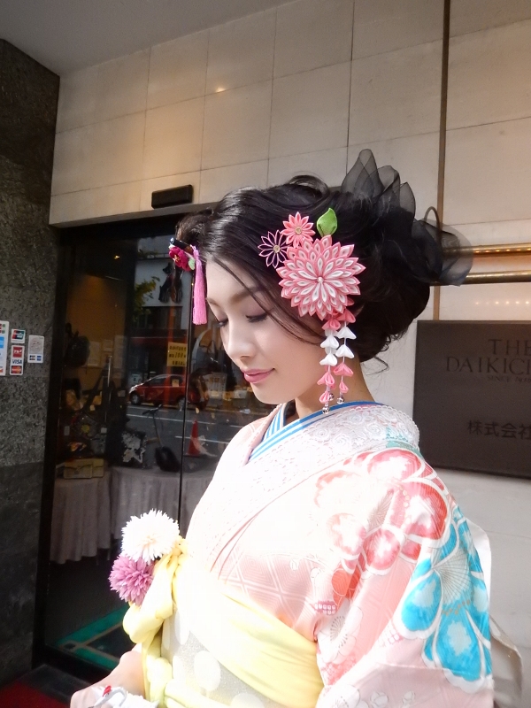 先生の作品はレトロモダンなお振袖によく似合うヘアーと着付で