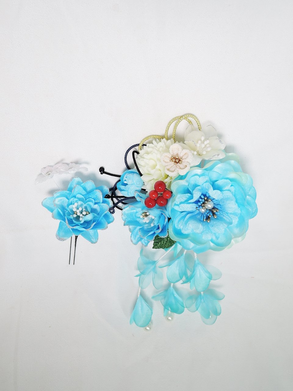 つまみ細工・パールさがり付 ラメフラワーコーム & ラメフラワーUピン 2点セット (水色)
