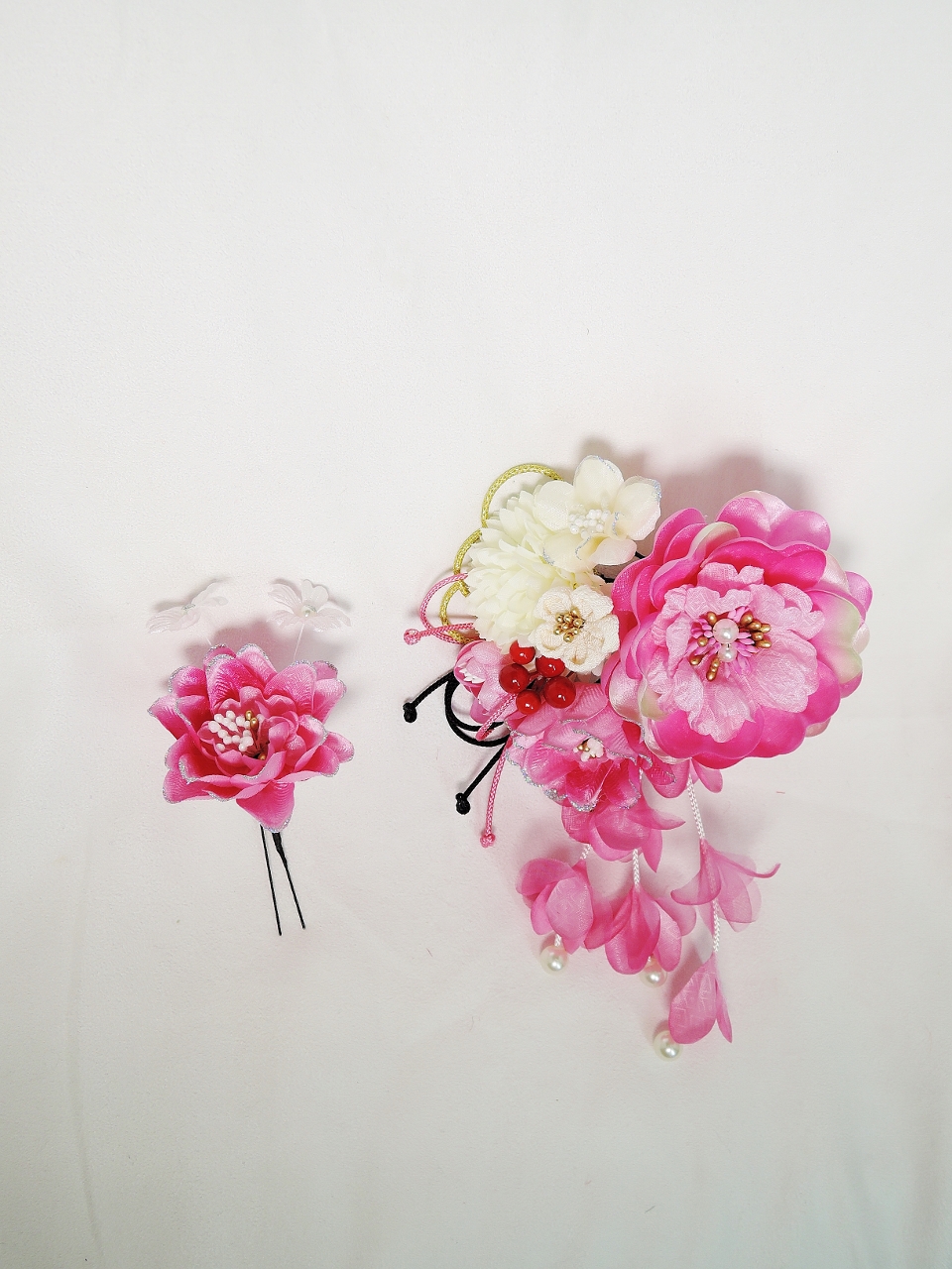 つまみ細工・パールさがり付 ラメフラワーコーム & ラメフラワーUピン 2点セット