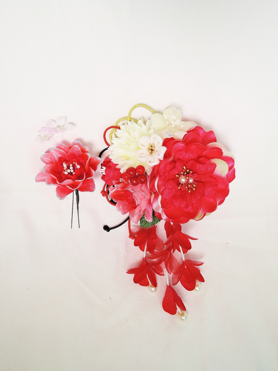 つまみ細工・パールさがり付 ラメフラワーコーム & ラメフラワーUピン 2点セット (赤)