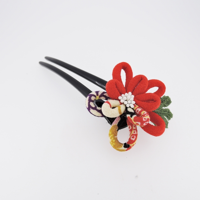 ちりめん紐花 横7cm×たて6cm かんざし 長さ10cm 色:赤に和柄