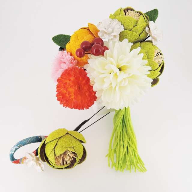 つまみ細工つばき・菊フラワ-コ-ムふさ下がり&ミニフラワーセット 拡大する