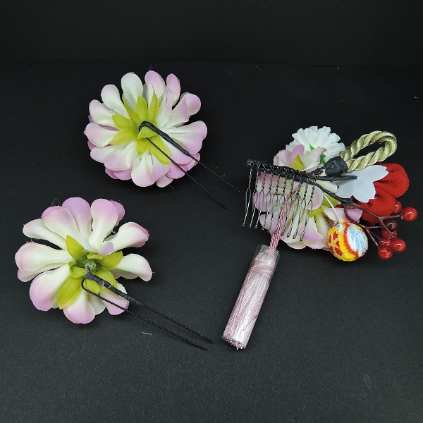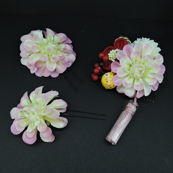 > つまみ付フラワ-コ-ムふさ付・ミニ3点セット 薄ピンク