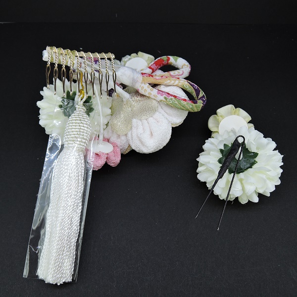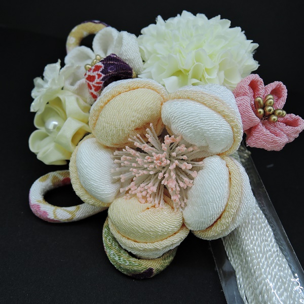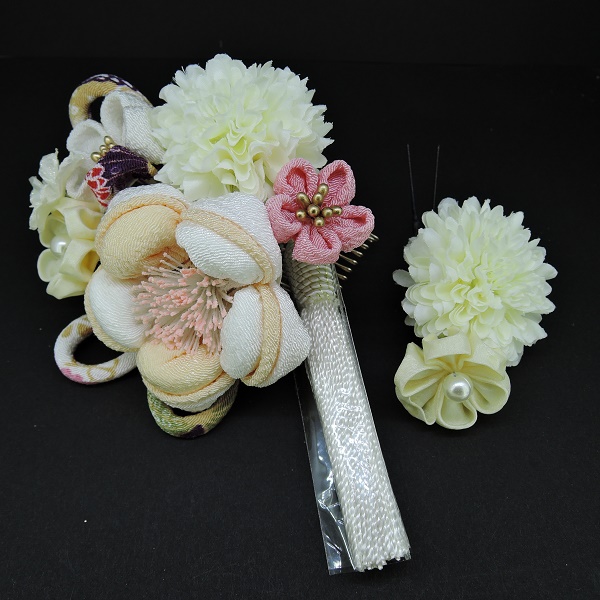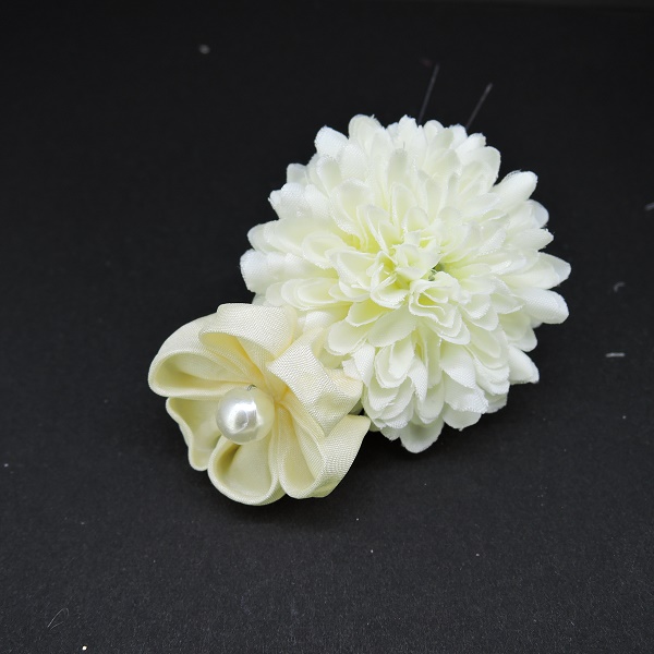 > つまみ細工フラワ-コ-ム・ミニ2点セット 白/ベ-ジュ