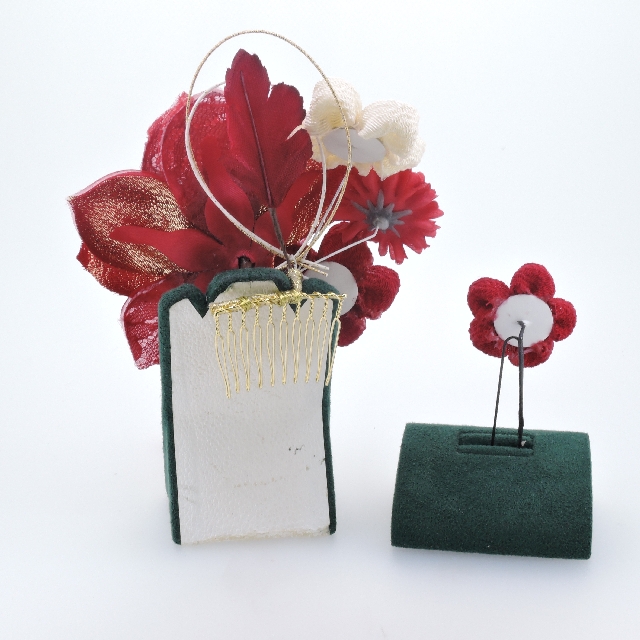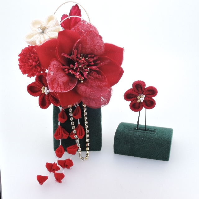 つまみ細工付フラワー コーム&Uピン2点セット(赤)